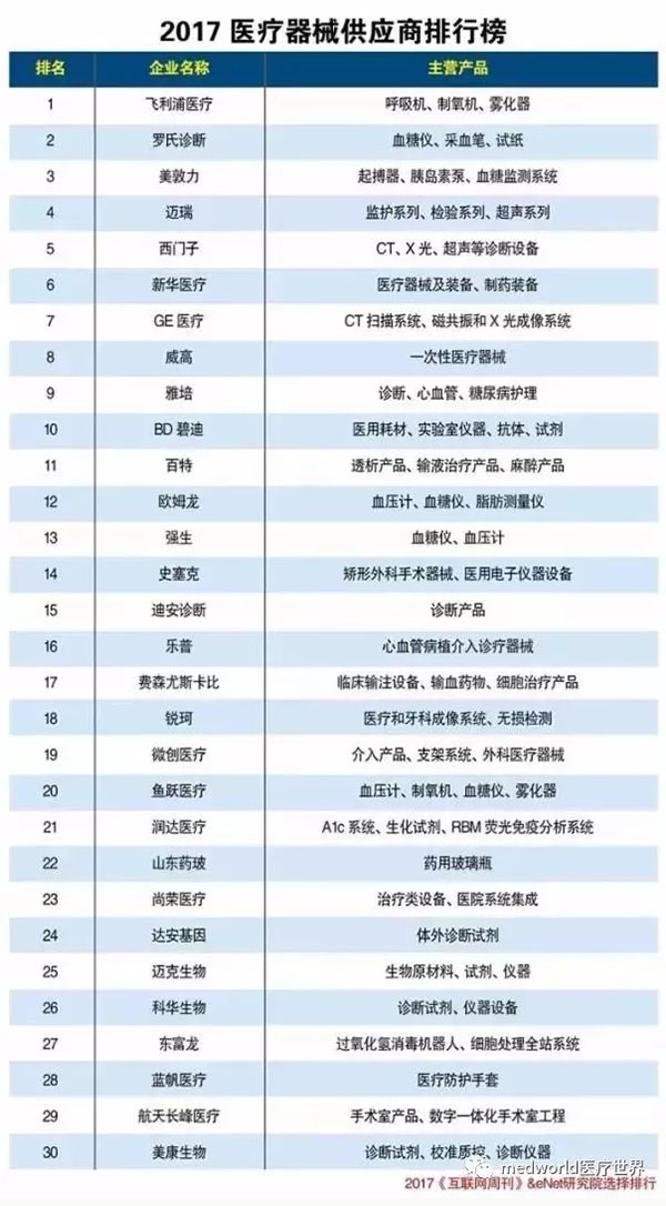 不過,由“eNet&Ciweek”發(fā)布的一份“2017中國醫(yī)療器械供應商排行榜”出爐了,算是給出了大概的答案。