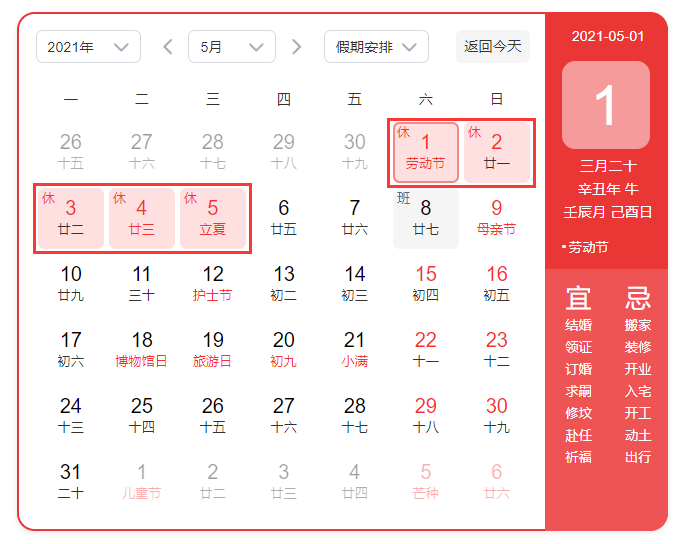 2021年北京華康普美科技有限公司,“五一勞動節”假期為:5月1日-5月5日放假調休,共5天。 4月25日(星期日)、5月8日(星期六)上班。