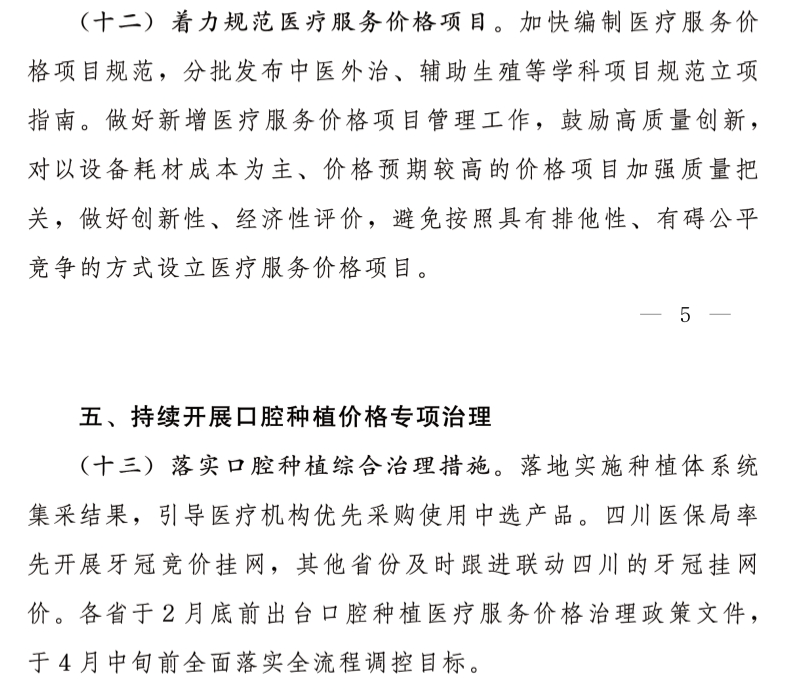一方面要落實口腔種植綜合治理措施。落地實施種植體系統集采結果,引導醫療機構優先采購使用中選產品。四川醫保局率先開展牙冠競價掛網,其他省份及時跟進聯動四川的牙冠掛網價。各省于2月底前出臺口腔種植醫療服務價格治理政策文件,于4月中旬前全面落實全流程調控目標。