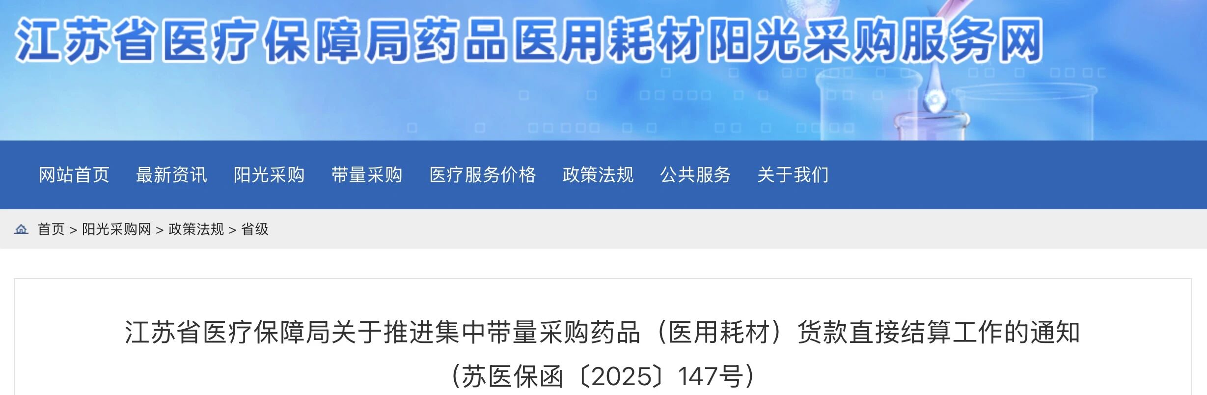 近日,江蘇醫保局發布《關于推進集中帶量采購藥品(醫用耗材)貨款直接結算工作的通知》(簡稱《通知》)。