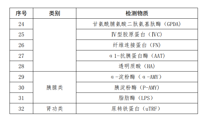其中,初步遴選出32個品種并進行公示,包括糖代謝、離子微量元素、血脂和脂蛋白、肝功類、胰腺類、腎功類等6個類別。