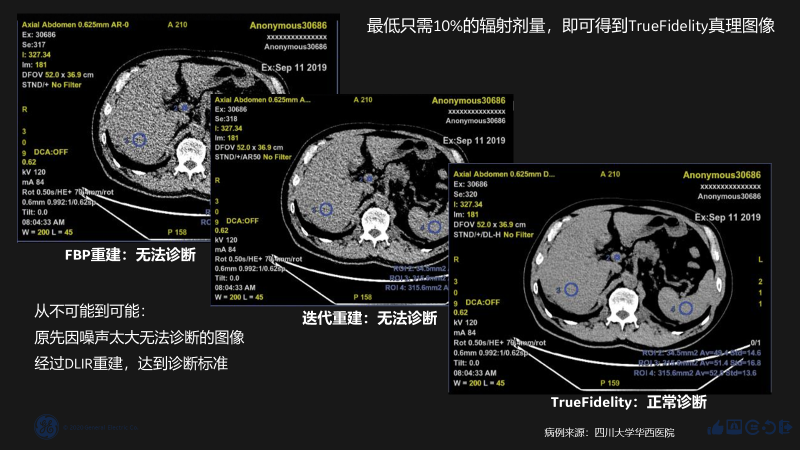 在四川大學華西醫院提供的臨床測試中,應用了TrueFidelity的圖像下完全達到了常規的診斷標準,解決了超低劑量CT掃描導致的噪聲太大無法診斷的問題,且最低只需10%的輻射劑量,就得到了TrueFidelity真理圖像。