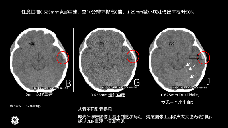 北京兒童醫院的測試病例也顯示,經過TrueFidelity,任意掃描0.625mm薄層重建,空間分辨率能提高8倍,1.25mm微小病灶檢出率提升50%,最終額外發現了3個之前看不到的微小病灶。