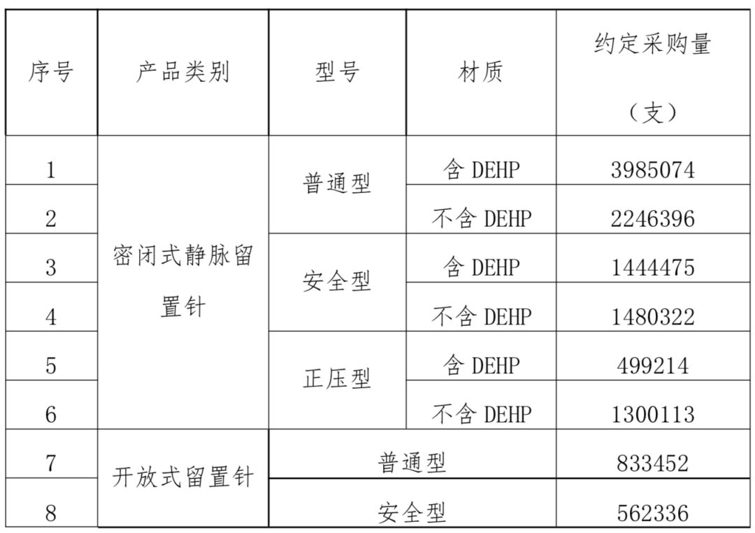 留置針類帶量采購文件顯示,約定采購量根據參與集中采購的醫療機構上報的 2019 年總采購量 80%確定,將對12351382個留置針進行帶量采購。