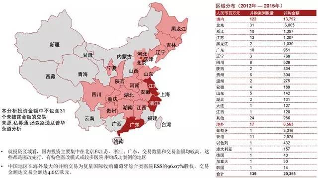 從地域來看,2012年至2015年,境內醫(yī)院并購活動主要集中在北京、江蘇、浙江和廣東等醫(yī)改先行地區(qū),四地并購數(shù)量占總數(shù)的一半以上,投資金額占總額約70%。