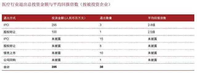 報告顯示,醫(yī)療健康企業(yè)的投資退出方式主要為上市和股權轉讓,披露金額項目的平均投資回報率在2至8倍之間,上市板塊主要集中在香港主板和新三板。