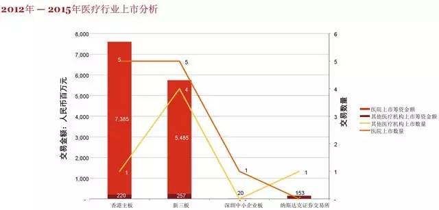 醫(yī)療健康企業(yè)的投資退出方式主要為上市和股權轉讓,披露金額項目的平均投資回報率在2至8倍之間。根據(jù)統(tǒng)計,2012年至2015年間,共計有17家醫(yī)療健康行業(yè)企業(yè)成功上市,總計籌資人民幣127.7億元,上市板塊主要集中在香港主板和新三板。