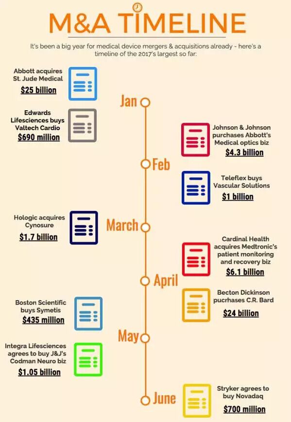 對于醫療器械行業而言,2017年注定是忙碌的一年。在過去的短短6個月,該領域已發生了數宗巨額交易,例如雅培制藥250億美元收購心臟設備制造商圣猶達醫療,貝克頓-迪金森240億美元收購巴德醫療科技公司;康德樂61億美元收購美敦力旗下醫療用品業務。