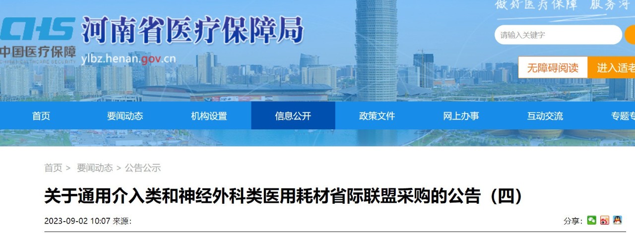 9月2日,河南醫保局發布《關于通用介入類和神經外科類醫用耗材省際聯盟采購的公告(四)》(簡稱《公告》)。