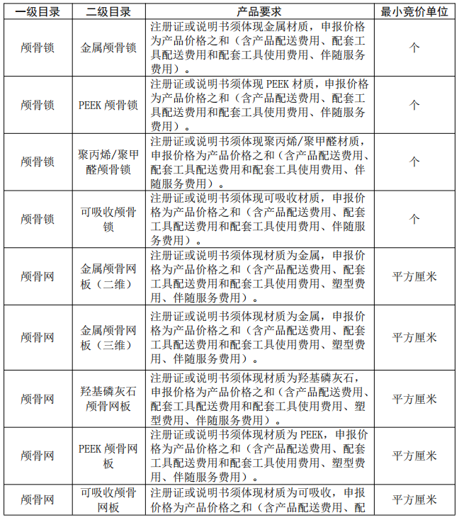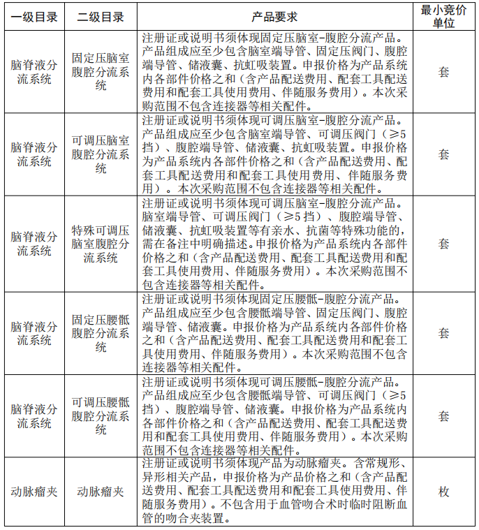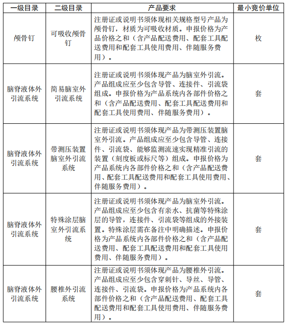 神經外科集采品種:顱骨鎖、顱骨網、顱骨連接片、顱骨蓋孔板、顱骨釘、固定壓腦室腹腔分流系統、可調壓腦室腹腔分流系統、固定壓腰骶腹腔分流系統、可調壓腰骶腹腔分流系統、簡易腦室外引流系統、帶測壓裝置系統腦室外引流系統、腰椎外引流系統、動脈瘤夾。