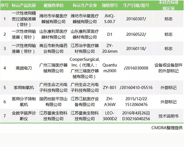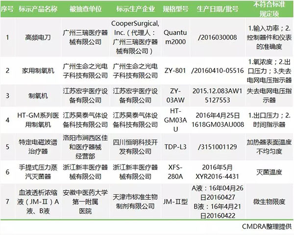 被抽檢項目為標識標簽、說明書等項目不符合標準規(guī)定的醫(yī)療器械產(chǎn)品:涉及7家企業(yè)的4個品種7批(臺)。