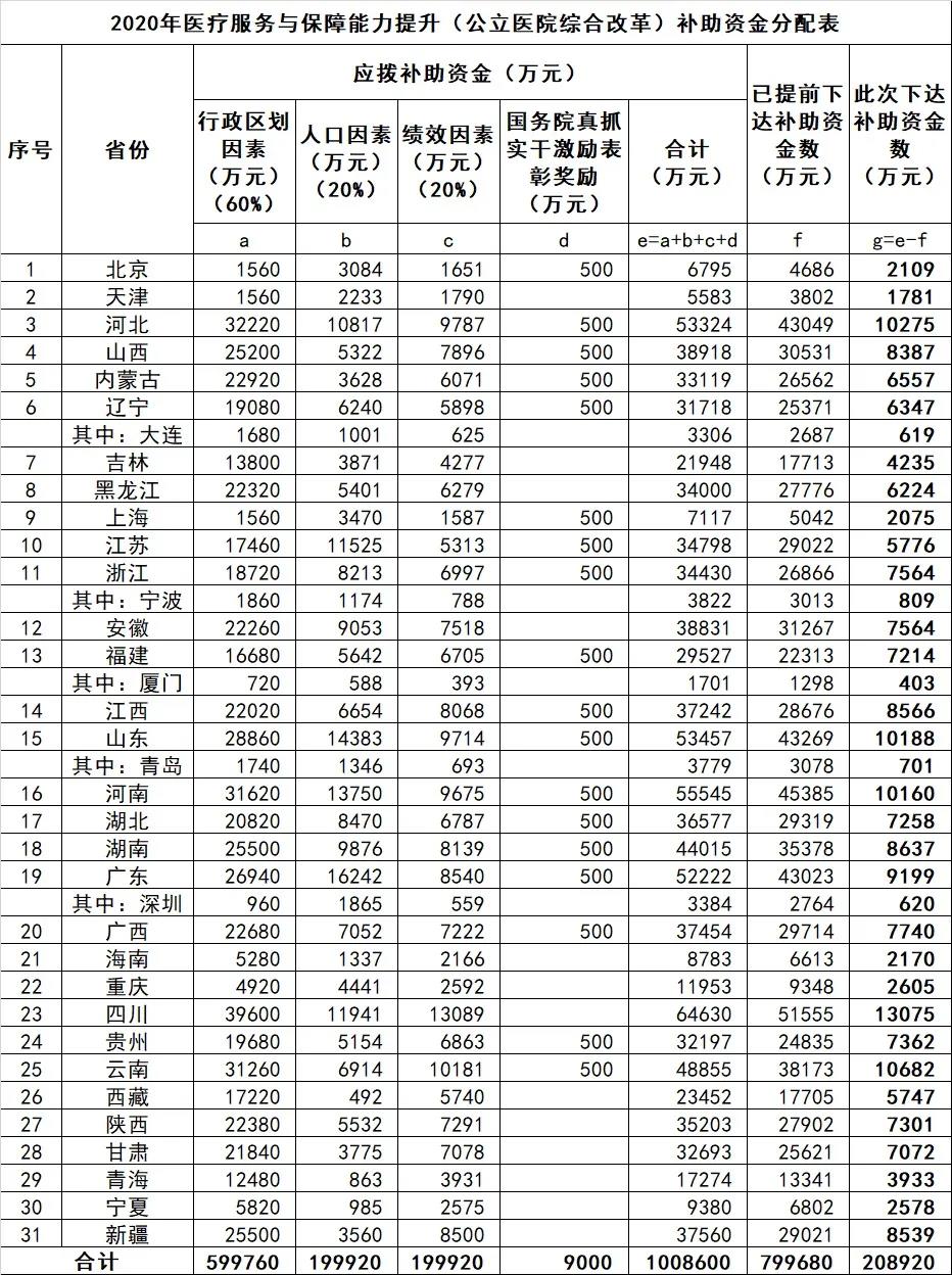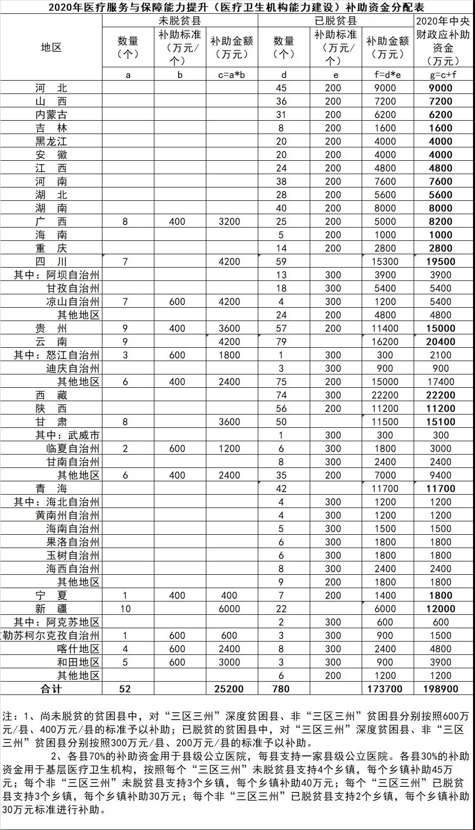 財政部與國家衛生健康委發布《關于下達2020年醫療服務與保障能力提升(醫療衛生機構能力建設)補助資金預算的通知》,對各個省份的資金做了公示。