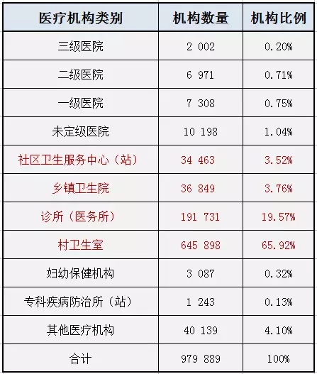 如上圖表所示,雖然國內(nèi)大型醫(yī)院的熱度很高,但是基層醫(yī)療機構(gòu)的數(shù)量遠(yuǎn)遠(yuǎn)高于這些醫(yī)院,并且門診診次占60%以上, 是門診服務(wù)量的主體。但是,很奇怪的是我國基層醫(yī)療市場的業(yè)務(wù)規(guī)模還不足30%,遠(yuǎn)小于三級和二級醫(yī)院。 基層醫(yī)療的現(xiàn)狀,也可以從整體基數(shù)占比最大的村衛(wèi)生室來了解。目前來看,服務(wù)能力是最大瓶頸。