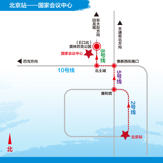 乘地鐵2號(hào)線至雍和宮站,站內(nèi)換乘地鐵5號(hào)(天通苑北方向),至惠新西街南口站下,換乘地鐵10號(hào)線(巴溝方向)至北土城站下,再乘地鐵8號(hào)線(回龍觀東大街方向),在奧林匹克公園下車(E口出)。