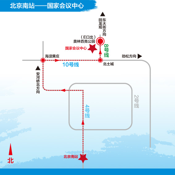 地鐵4號(hào)線(安河橋北方向)至海淀黃莊站,換乘10號(hào)線(勁松方向),至北土城站下車,再乘地鐵8號(hào)線(回龍觀東大街方向),在奧林匹克公園下車(E口出)。