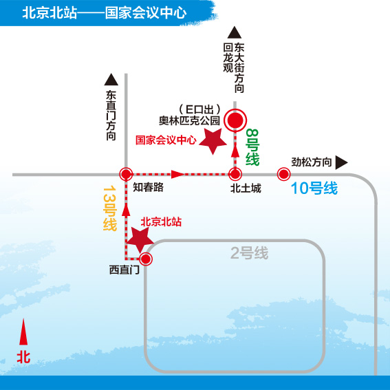 乘地鐵13號(hào)線(東直門方向)在知春路站下車,站內(nèi)換乘地鐵10號(hào)線(勁松方向),至北土城站下車,再乘地鐵8號(hào)線(回龍觀東大街方向),在奧林匹克公園下車(E口出)。