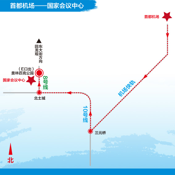 乘車線路:乘機(jī)場(chǎng)大巴至西單民航大廈下車,向西步行約250米換乘地鐵1號(hào)線,至東單站換乘地鐵5號(hào)線(天通苑北方向),至惠新西街南口站下,換乘地鐵10號(hào)線(巴溝方向)至北土城站下,再乘地鐵8號(hào)線(回龍觀東大街方向),在奧林匹克公園下車(E口出)。