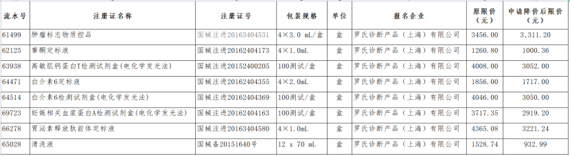 今年4月,羅氏診斷產(chǎn)品(上海)有限公司自主申請,降低部分檢驗(yàn)試劑產(chǎn)品在安徽省的掛網(wǎng)限價(jià)。