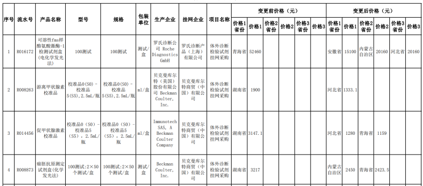 今年7月,青海省藥品采購中心發(fā)布體外診斷試劑降價(jià)通知。根據(jù)通知內(nèi)容,羅氏診斷、貝克曼庫爾特申請下調(diào)了部分試劑的價(jià)格,主要包含22個(gè)化學(xué)發(fā)光試劑項(xiàng)目和校準(zhǔn)品。