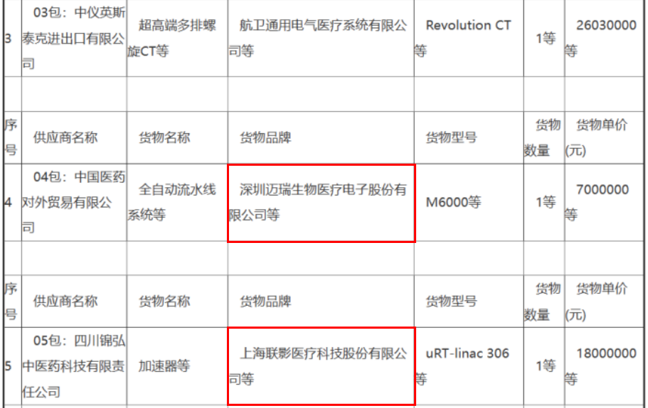 主要標的信息顯示,01包核心產品無創呼吸機、04包核心產品全自動流水線系統,均由邁瑞提供;05包核心產品加速器,由聯影提供。貨物型號、數量及單價如下: