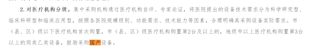 市(縣、區(qū))級(jí)以下醫(yī)療機(jī)構(gòu)首次購置,市(縣、區(qū))級(jí)醫(yī)療機(jī)構(gòu)購置第2臺(tái)及以上的,地級(jí)市以上醫(yī)療機(jī)構(gòu)購置第3臺(tái)以上的同類乙類設(shè)備,鼓勵(lì)采購國(guó)產(chǎn)設(shè)備。