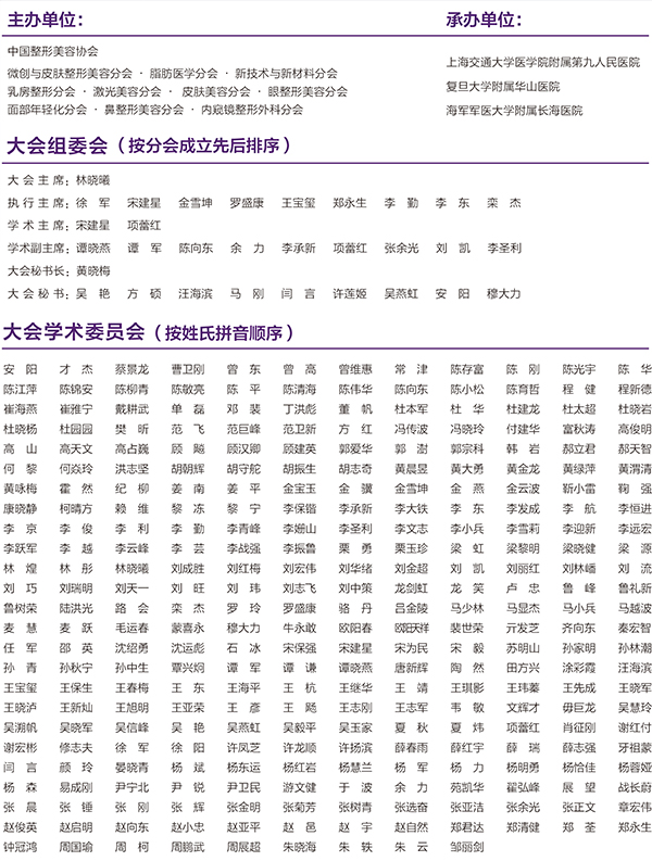 由中國整形美容協會微創與皮膚整形美容分會、脂肪醫學分會、新技術與新材料分會、乳房整形分會、激光美容分會、皮膚美容分會、眼整形美容分會、面部年輕化分會、鼻整形美容分會、內窺鏡整形外科分會聯合主辦,上海交通大學醫學院附屬第九人民醫院、復旦大學附屬華山醫院、海軍軍醫大學附屬長海醫院共同承辦的中國整形美容協會第七屆全國微創醫學美容大會將于2018年9月14-16日在上海召開。