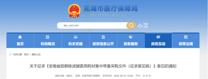 8月23日,安徽蕪湖市醫(yī)保局發(fā)布《關于征求<安徽省腔靜脈濾器醫(yī)用耗材集中帶量采購文件(征求意見稿)>意見的通知》(以下簡稱《征求意見稿》)。