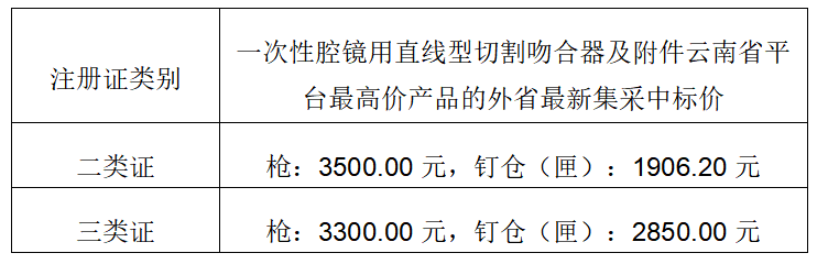 其中,“一次性腔鏡用直線型切割吻合器及附件”二類、三類注冊證產(chǎn)品申報價,分別不得高于目前云南省藥品集中采購平臺集采掛網(wǎng)二類、三類注冊證最高價產(chǎn)品的外省最新集采中標價(區(qū)分槍和釘)。