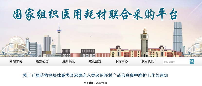 國家組織醫用耗材聯合采購平臺藥物涂層球囊類及泌尿介入類醫用耗材產品信息集中維護時間為2025年8月1日至8月11日12時。
