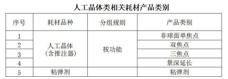 人工晶體類相關(guān)耗材包括:獲得中華人民共和國醫(yī)療器械注冊證的人工晶體耗材(不包括硬性人工晶體、有晶體眼人工晶體, 下同)、粘彈劑。人工晶體耗材須包含可與其配套使用的推注器。