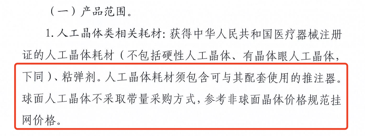 其中,球面人工晶體不采取帶量采購方式,參考非球面晶體價格規(guī)范掛網(wǎng)價格。
