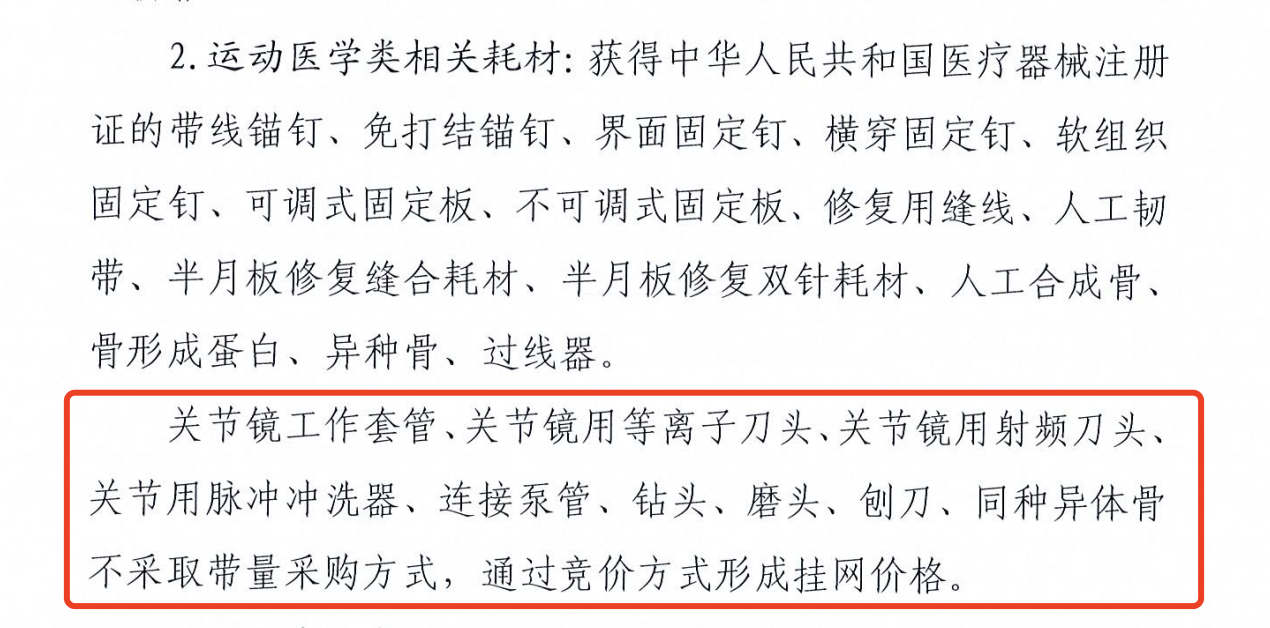 關(guān)節(jié)鏡工作套管、關(guān)節(jié)鏡用等離子刀頭、關(guān)節(jié)鏡用射頻刀頭、 關(guān)節(jié)用脈沖沖洗器、連接泵管、鉆頭、磨頭、刨刀、同種異體骨不采取帶量采購方式,通過競價方式形成掛網(wǎng)價格。