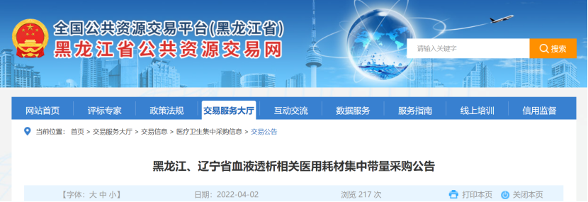 近日,黑龍江公共資源交易中心發布《黑龍江、遼寧省血液透析相關醫用耗材集中帶量采購公告》,將對11種血液透析類耗材開展集采。