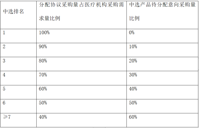 醫院填報了采購需求量但未中選的企業產品采購需求量、中選產品待分配意向采購量及申報價格高于醫療機構現行實際采購價格的企業需求量合并為醫療機構的待分配總量,醫療機構的待分配總量可自主分配給中選產品中價格適宜的產品,但分配給第1名的待分配總量不得小于中選企業平均分配比例,即:如5家企業中選,則第1名得到待分配總量的比例不得小于20%,申報價格高于醫療機構現行實際采購價格的企業除外。