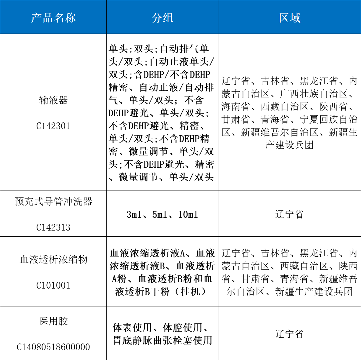 此次價格聯動采購品種為輸液器、預充式導管沖洗器、血液透析濃縮物、醫用膠,品種分組、聯動地區如下: