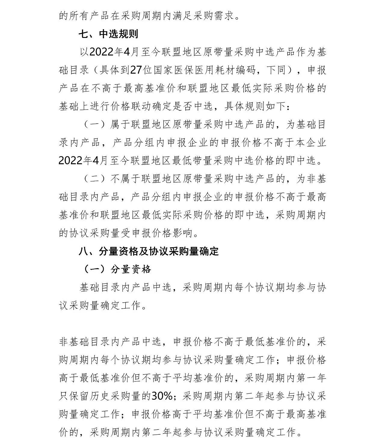 以2022年4月至今聯盟地區原帶量采購中選產品作為基礎目錄(具體到27位國家醫保醫用耗材編碼,申報產品在不高于最高基準價和聯盟地區最低實際采購價格的基礎上進行價格聯動確定是否中選,具體規則如下: