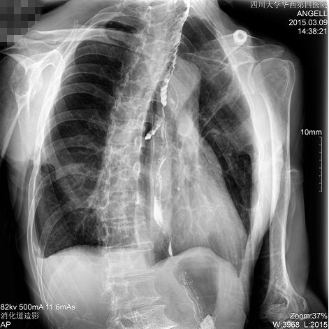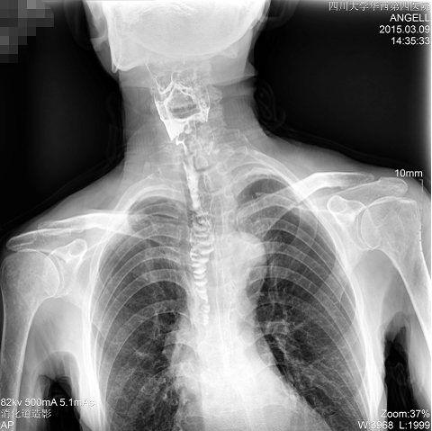 圖為斜位:通過(guò)動(dòng)態(tài)影像可以清楚看到鋇劑進(jìn)入了支氣管道