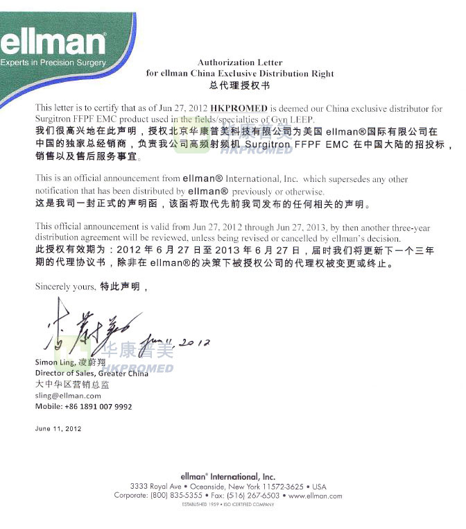 熱烈慶祝北京華康普美科技有限公司正式簽約成為美國ellman婦科利普刀產品中國獨家總代理