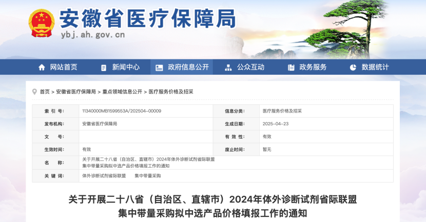 4月23日,安徽醫保局發布《關于開展二十八省(自治區、直轄市)2024年體外診斷試劑省際聯盟集中帶量采購擬中選產品價格填報工作的通知》,對擬中選產品的全國省級掛網最低價等價格開展填報工作。