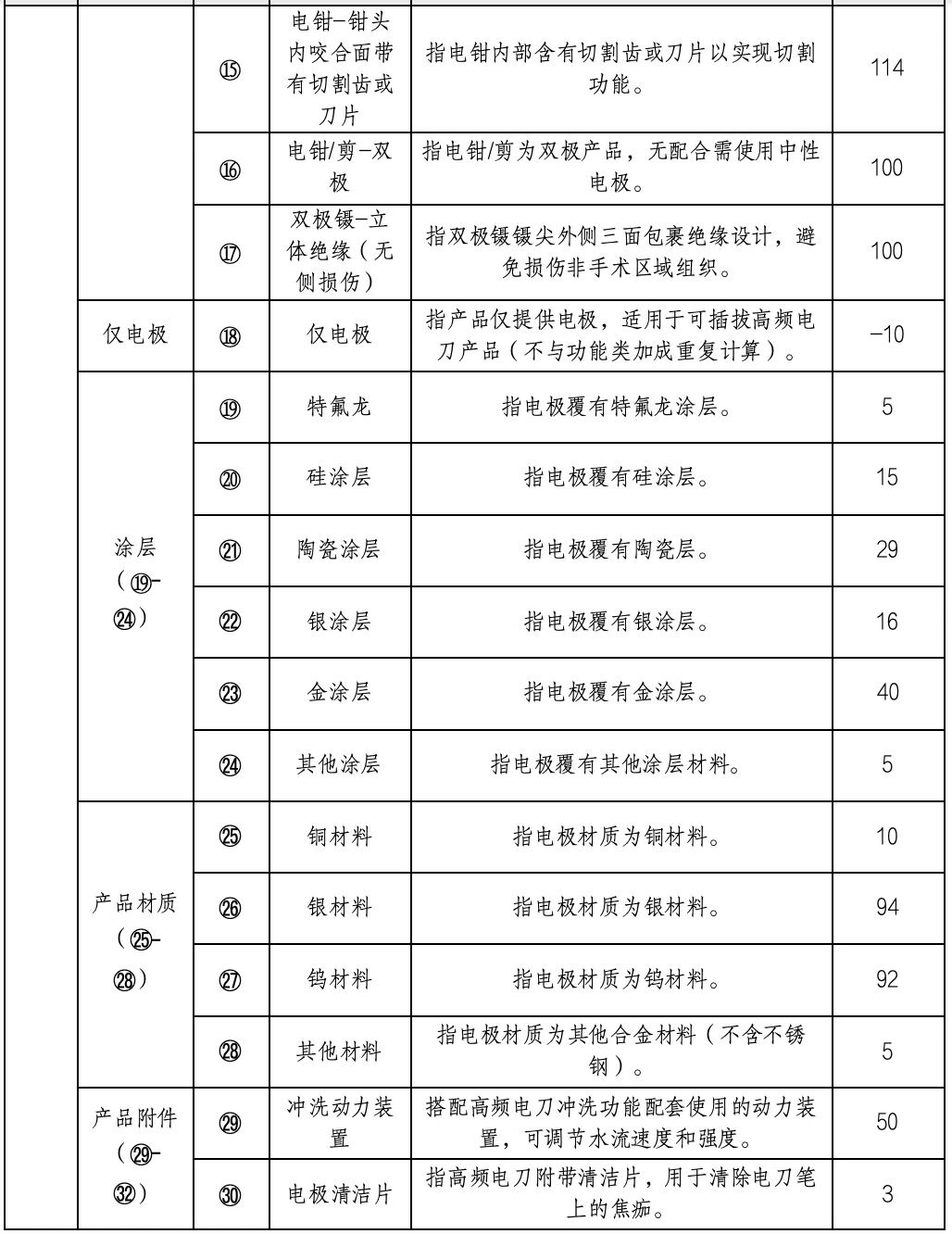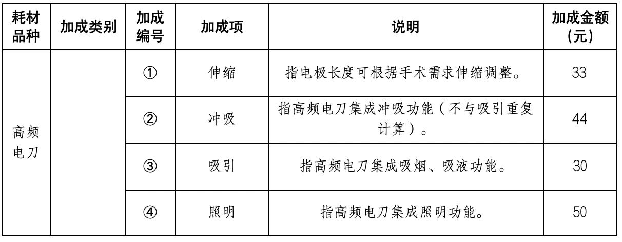 值得注意的是,本輪集采設(shè)置中選產(chǎn)品加成規(guī)則,伸縮、沖吸、照明、電極旋轉(zhuǎn)、涂層材料等均被列入加成項,且明確了具體加成金額。
