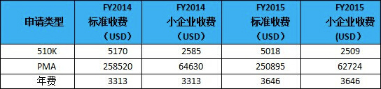 如2015財(cái)政年的510(k)申請,標(biāo)準(zhǔn)收費(fèi)為USD5018,小企業(yè)收費(fèi)為USD2509;2015財(cái)政年的PMA申請,標(biāo)準(zhǔn)收費(fèi)為USD250,895,小企業(yè)收費(fèi)為USD62,724。可以看出,有小企業(yè)資質(zhì)的企業(yè)所需繳納的費(fèi)用確實(shí)比普通企業(yè)減少許多。不過,對于年費(fèi),普通企業(yè)與小企業(yè)需繳納的金額是一樣的。對比2014財(cái)政年(FY2014)的收費(fèi),見下表: