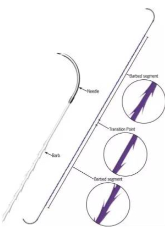 圖 1 標準倒刺縫線的三部分:針,雙向倒刺區(qū),過渡區(qū)