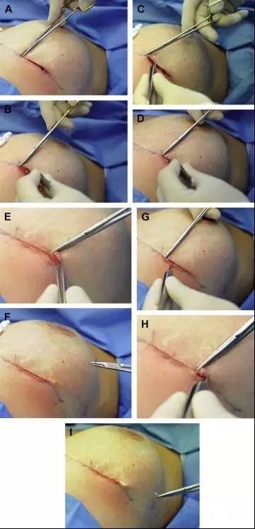 圖 2 A~I 示倒刺縫線應用于假體隆乳術(shù)