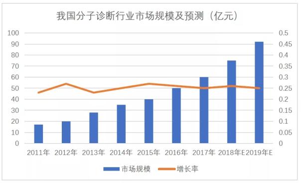 火石創造統計數據:近年全球分子診斷行業年均增速約為11%,而我國分子診斷行業年均增速則達到了24%,為全球增速的兩倍。預計到2019年,我國分子診斷市場規模將有望超過 90 億元。