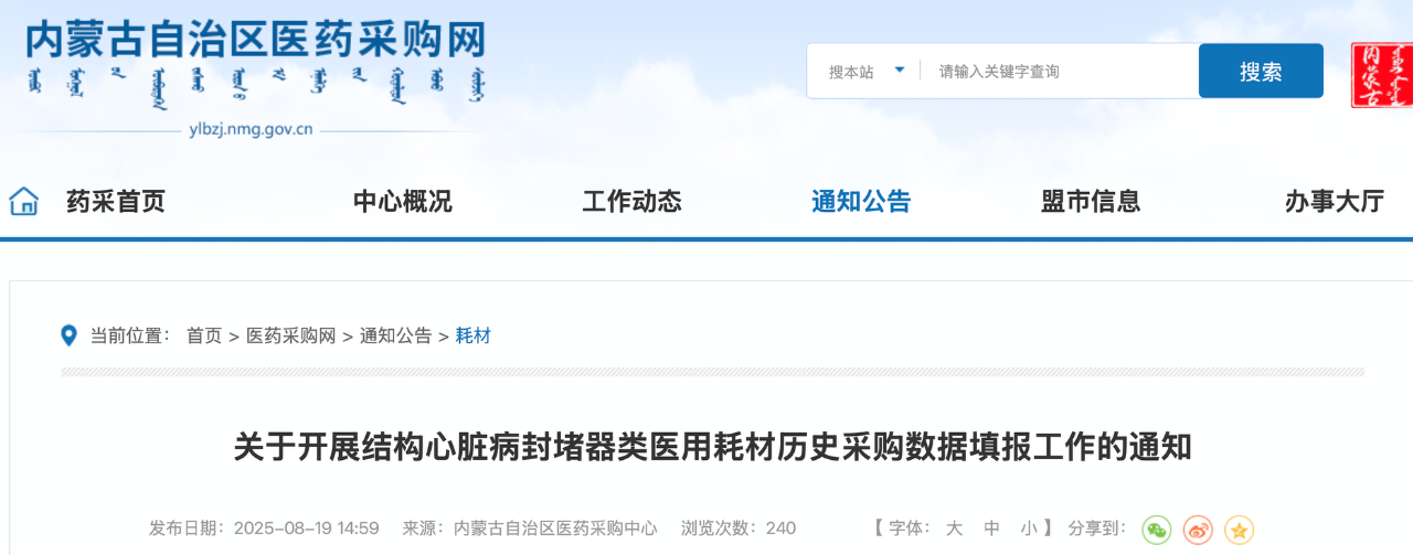 8月19日,四川、內蒙古發(fā)布《開展福建省牽頭省際聯(lián)盟結構心臟病封堵器類醫(yī)用耗材歷史采購數(shù)據(jù)填報工作的通知》。