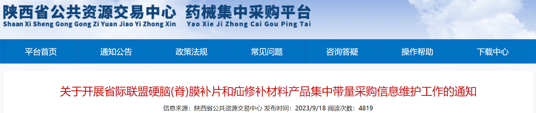 9月19日,陜西省公共資源交易中心又發(fā)布了《關(guān)于硬腦(脊)膜補(bǔ)片和疝修補(bǔ)材料產(chǎn)品集中帶量采購信息維護(hù)工作的補(bǔ)充通知》。