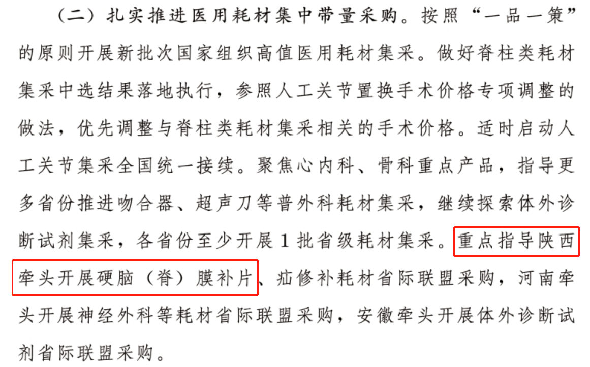 今年年初,國家醫(yī)保局發(fā)布《關(guān)于做好2023年醫(yī)藥集中采購和價格管理工作的通知》,提出扎實(shí)推進(jìn)醫(yī)用耗材集中帶量采購,其中就明確點(diǎn)出了要重點(diǎn)指導(dǎo)陜西牽頭開展硬腦 (脊) 膜補(bǔ)片、修補(bǔ)耗材省際聯(lián)盟采購。