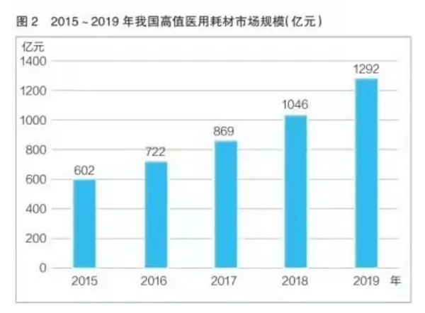 隨著醫療產業的高速發展,全球高值醫用耗材市場規模增長迅速。2019年,全球高值醫用耗材行業市場規模達1634.27億美元(見圖1),2015~2019年的年復合年增長率為14.83%。