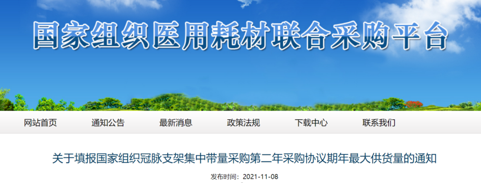11月8日,國家組織高值醫(yī)用耗材聯(lián)合采購辦公室發(fā)布《關(guān)于填報國家組織冠脈支架集中帶量采購第二年采購協(xié)議期年最大供貨量的通知》。自11月10日起,國家組織冠脈支架集中帶量采購中選企業(yè),開始填報第二年協(xié)議期各中選產(chǎn)品可供國內(nèi)的年最大供貨量。