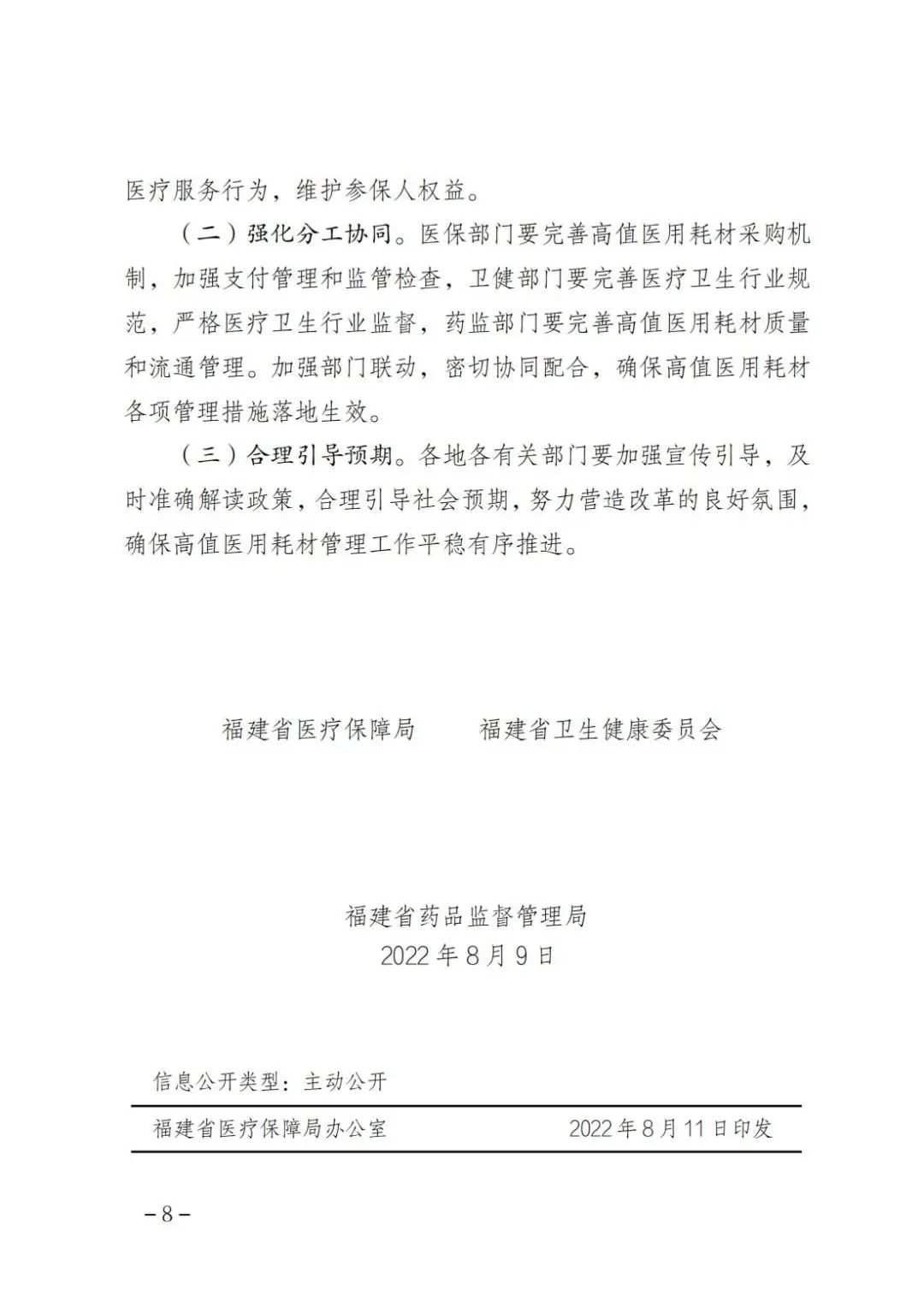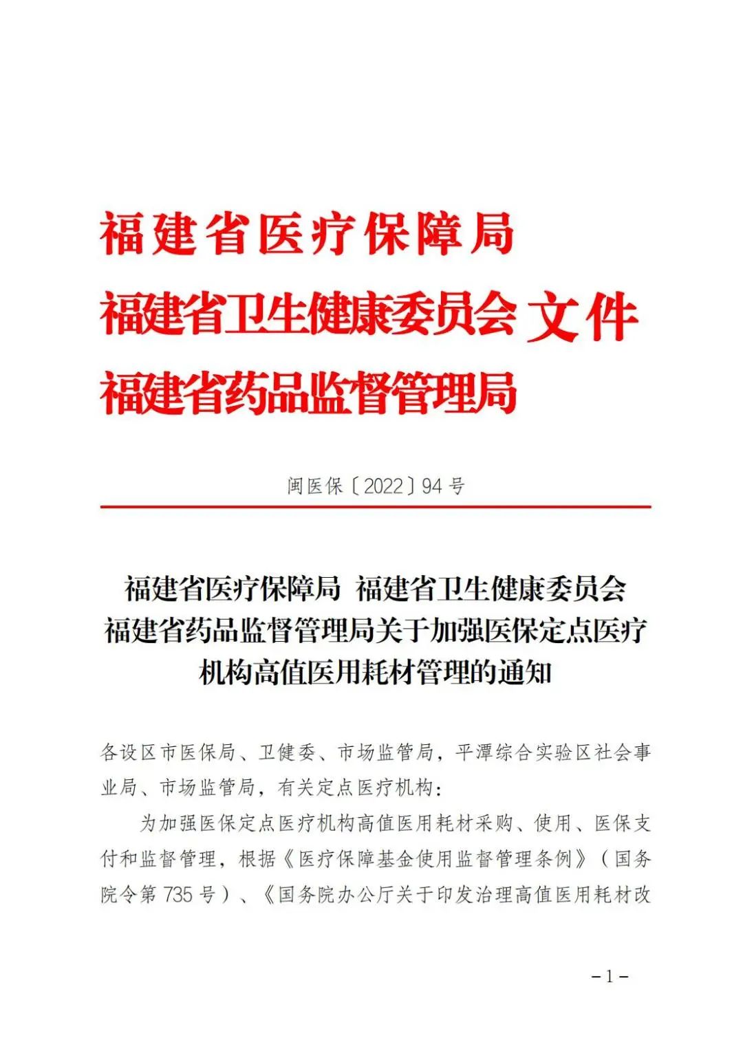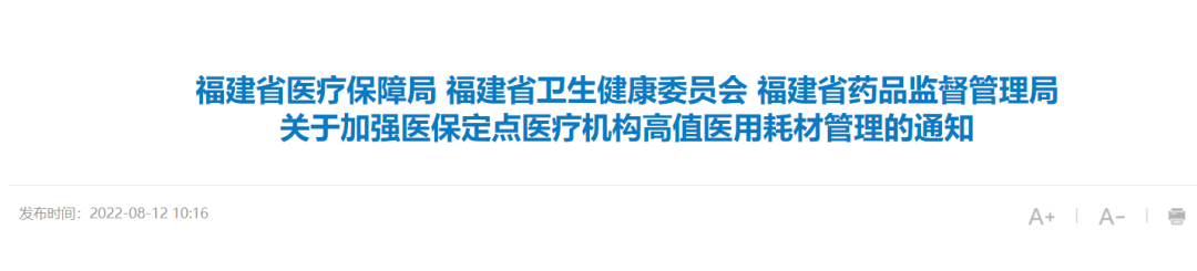 8月12日,福建省醫(yī)療保障局 福建省衛(wèi)生健康委員會 福建省藥品監(jiān)督管理局聯(lián)合發(fā)布了《關(guān)于加強醫(yī)保定點醫(yī)療機構(gòu)高值醫(yī)用耗材管理的通知》(以下簡稱《通知》)(原文見文末)。